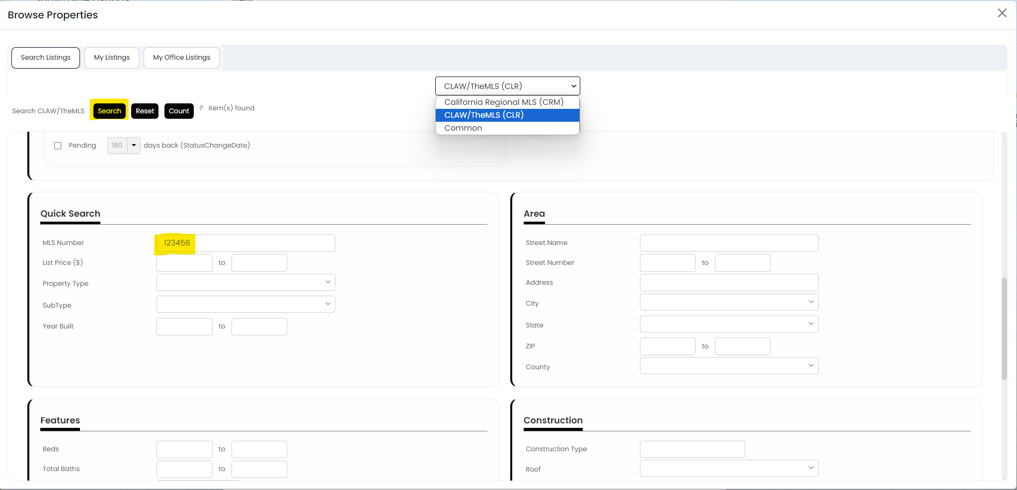 - Scroll down to the Quick Search section, enter the MLS#, and click Search.