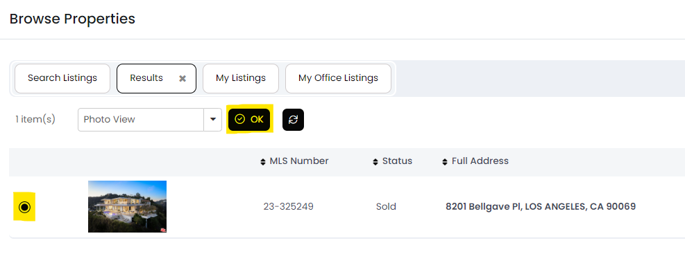 - In the property browser, locate and select the MLS where the listing was entered.