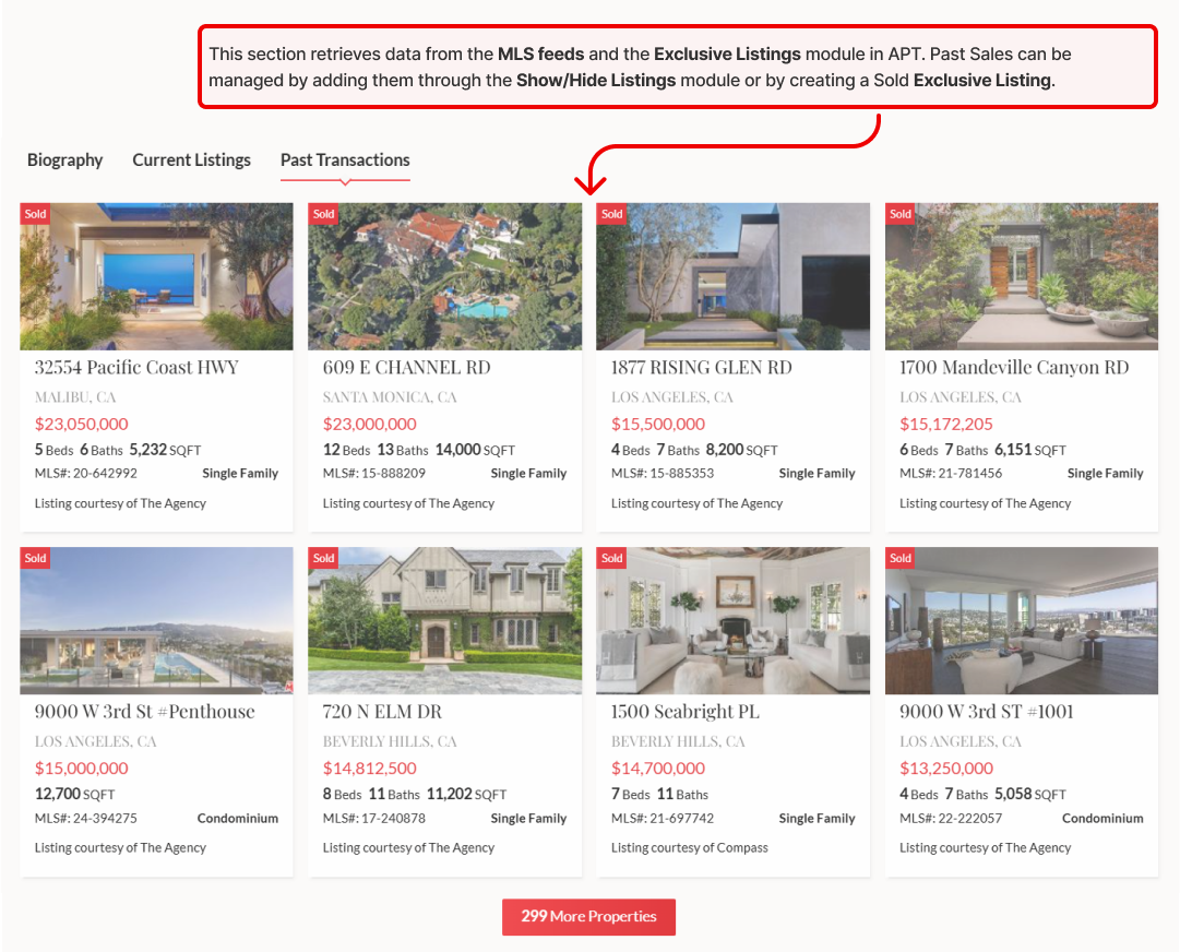 - The top section, featuring larger photos, pulls data from the MLS feeds and the Exclusive Listings module in APT. Past Sales can be managed by adding them through the Show/Hide Listings module or by creating a Sold Exclusive Listing.