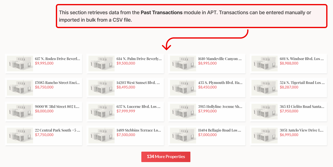 - The bottom section, displaying smaller photos, pulls data from the Past Transactions module in APT. Transactions can be entered manually or imported in bulk via a CSV file.