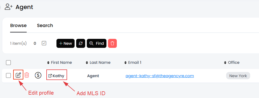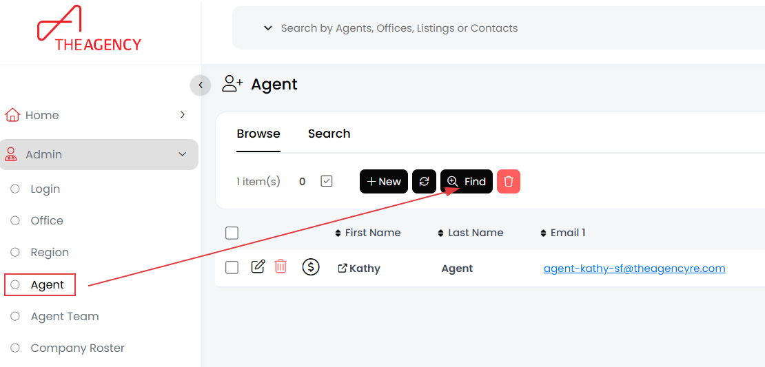 Click the FIND button and search for the agent using filters like name, role, office, or email.