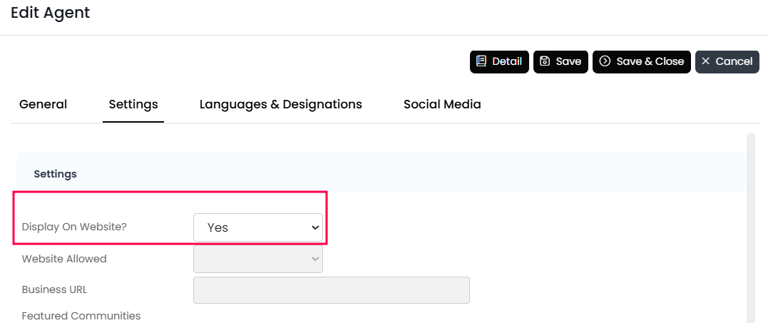 Click the pencil icon in the first column to edit the agent’s name, email, roles, title, license number, bio, social media, and more. Once your agent's profile is ready to go LIVE, scroll down to the Settings section and make sure "Display on Website" field is set to Yes. Save and Close the agent's profile.